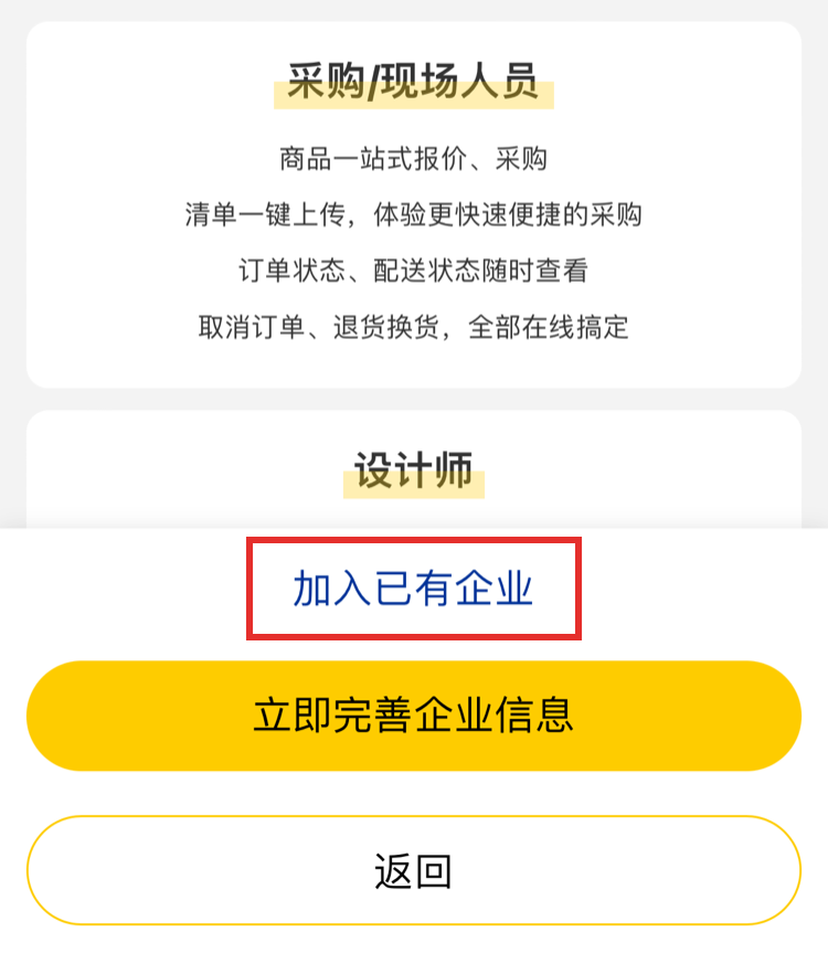 1.注册成为米思米个人会员后,直接在完成注册的页面点击【加入已有企业】。或者【我的】页面【加入企业】。