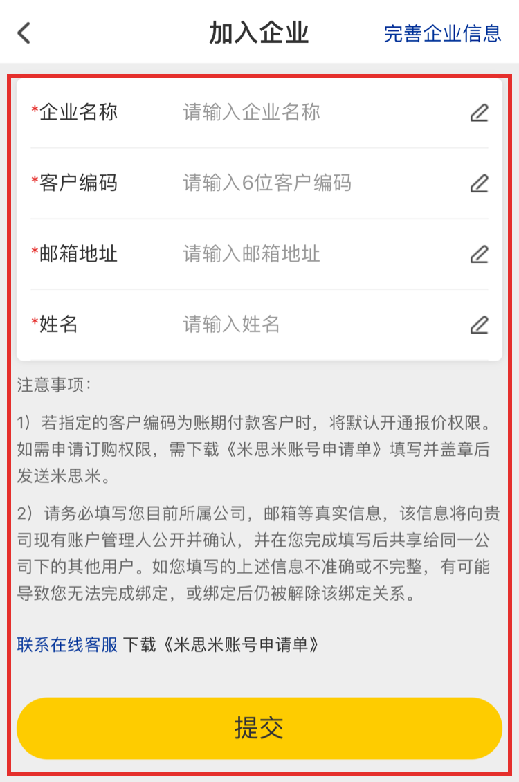 完善企业信息:您的企业未曾在米思米注册成为企业用户,请选择该方式。